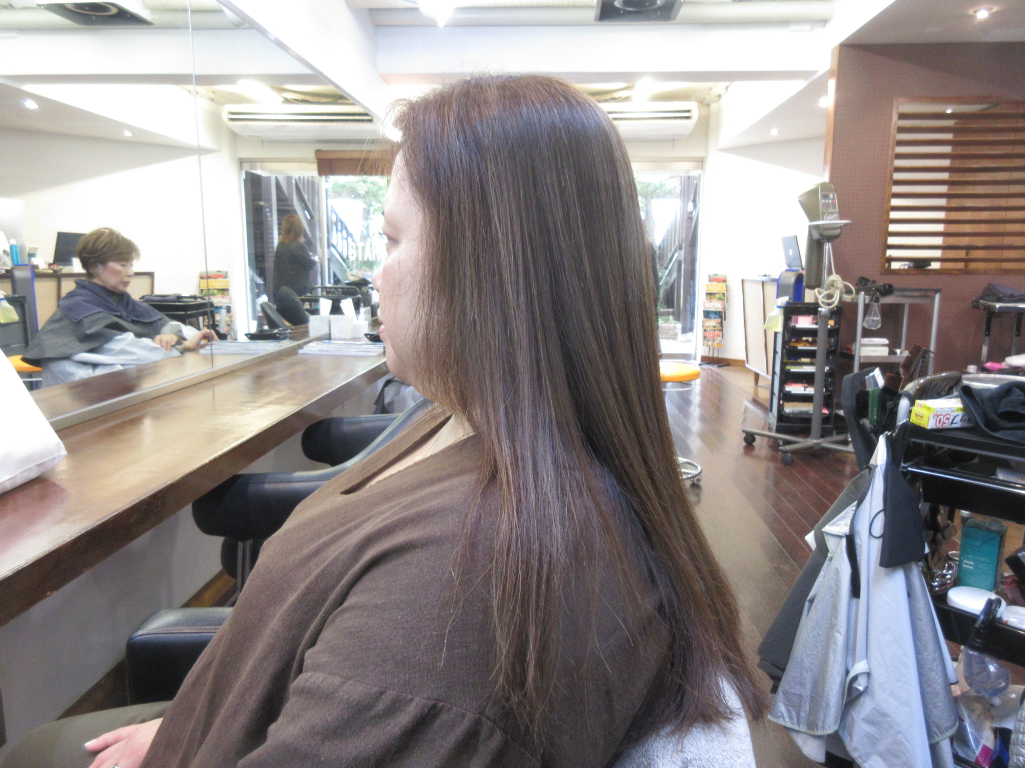 カットカラーで来店です。スタイルは毛先の乾燥した毛先をカットしました。カラーは明るいトーンです。酸熱トリートメントでケアします。