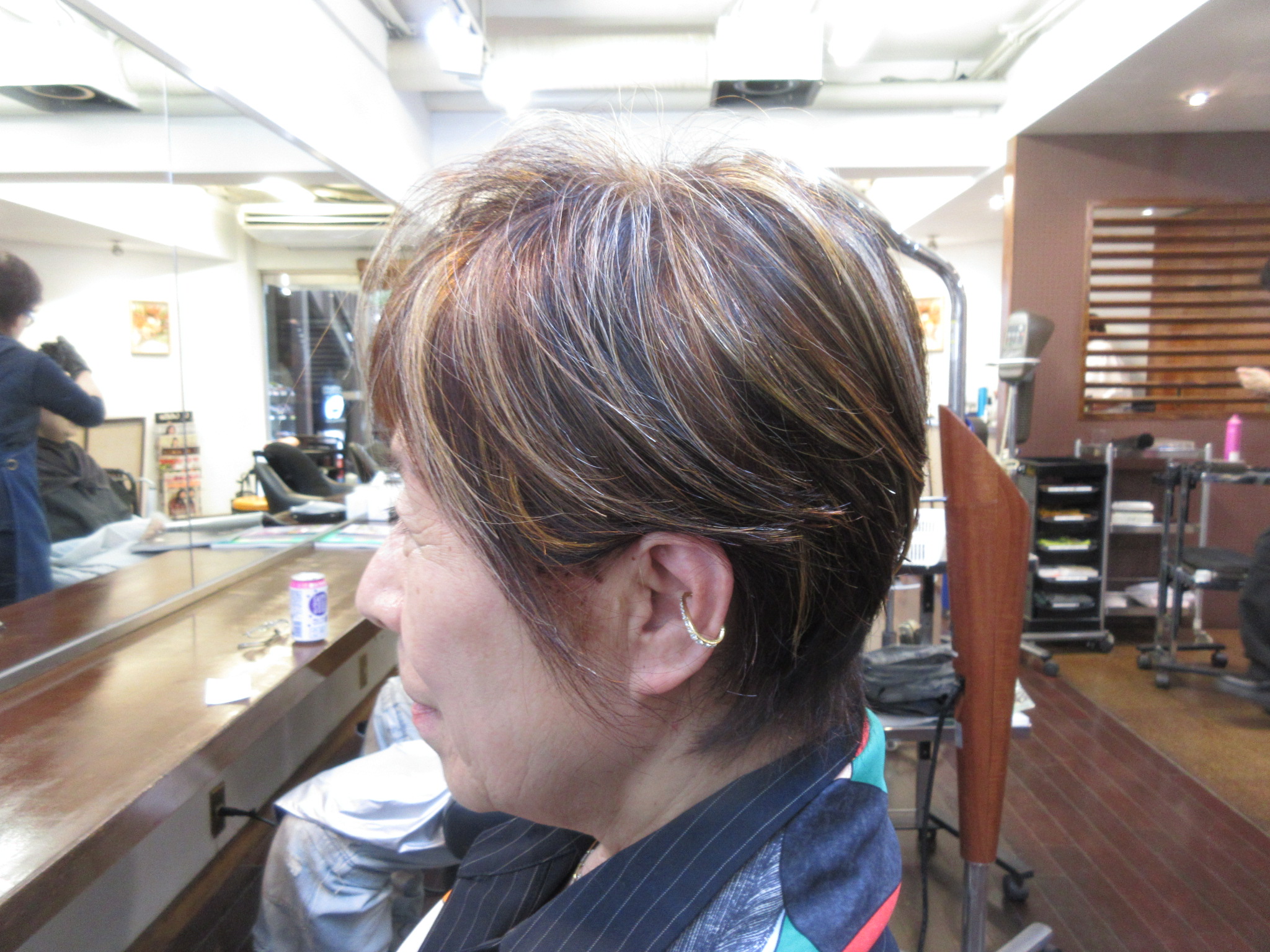 カットカラーで来店です。スタイルはボブヘアからショートヘアに変えました。カラーはハイライトを入れたヘアマニキュアデス。前回の矯正パーマを生かしたスタイルです。