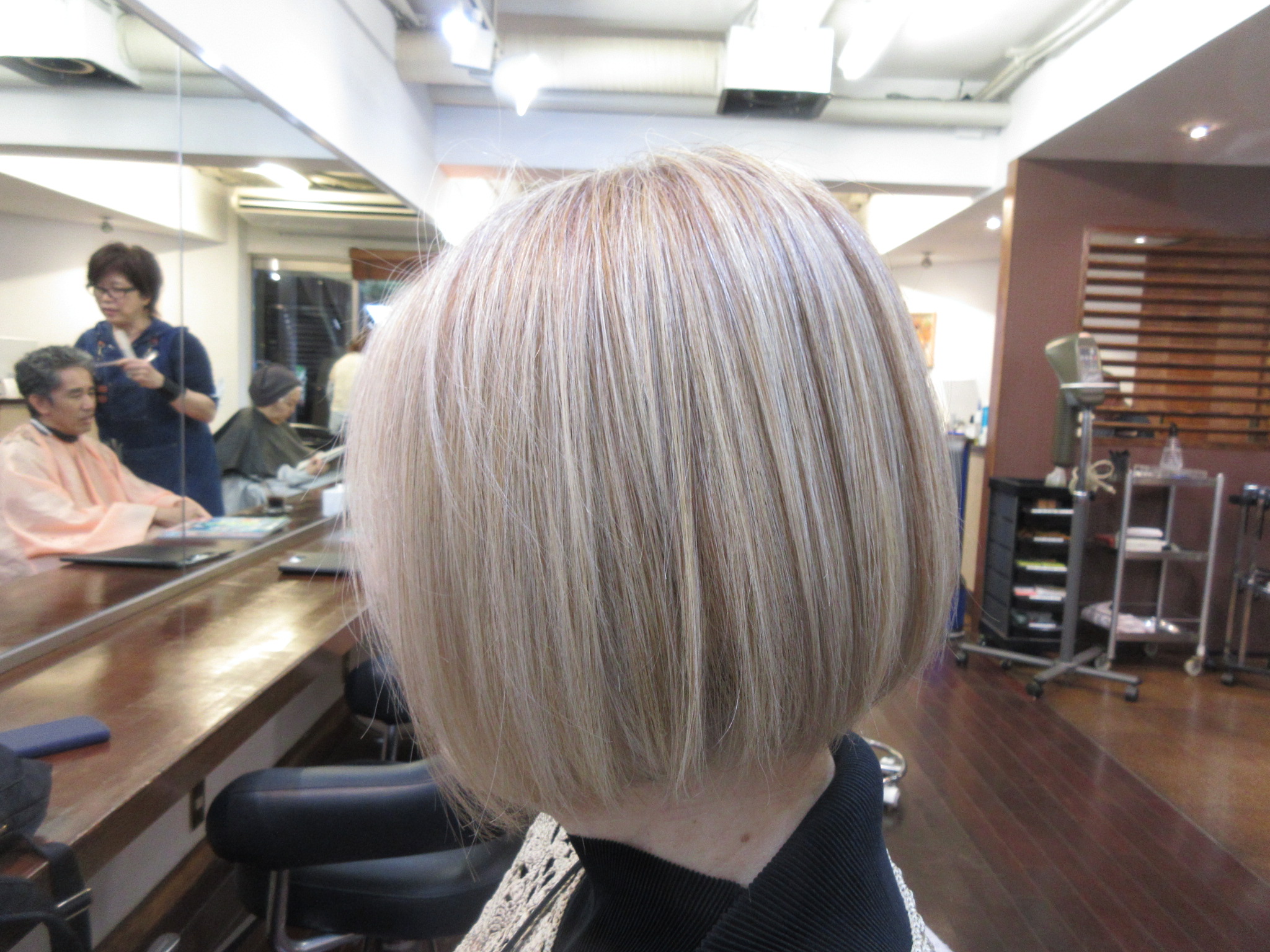 カットカラーで来店です。スタイルはボブヘアで少し伸ばします。カラーは白髪ぼかしです。ボブヘアですと白髪ぼかしが効果的です。酸熱トリートメントでケアしています。